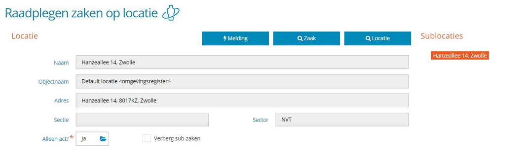 Bij het raadplegen van zaken op locatie, is te zoeken op melding, zaak of locatie